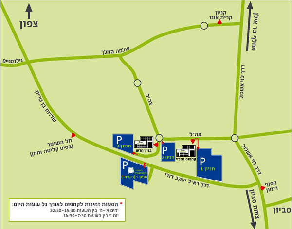* הסעות זמינות מחניון הבקו”ם (חניון מספר 5) לקמפוס קרית אונו לאורך כל שעות היום.