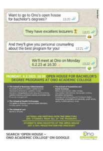 Ono Academic College will be holding an Open House for Bachelor’s Degree Programs on Monday, 6.2.2023 at 16:30 featuring the following programs: