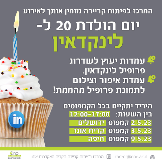 Ono Celebrates LinkedIn's 20th Birthday Ono Academic College’s Career Development Center will be celebrating the 20th birthday of the work social media site, LinkedIn by offering students: • Consulting about how to upgrade your LinkedIn profile • Makeup and photo booth for a stunning profile picture! The fair will be held on many of Ono’s […]