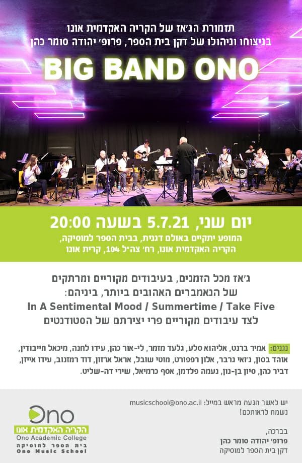 Big Band Ono, the Jazz Ensemble of Ono Academic College, conducted and directed by Prof. Yehuda Cohen, Dean of the Music School, will be returning to the stage on Monday, July 5, 2021 for a live concert in Ono’s Dganit Auditorium.