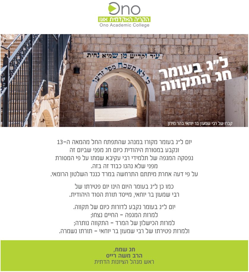 According to all opinions, Lag B’Omer was established as a day of hope. Despite the plague – life emerges triumphant; Despite the failure of the revolt – hope remained; And despite the death of Rabbi Shimon Bar Yochai – his teachings were preserved.
