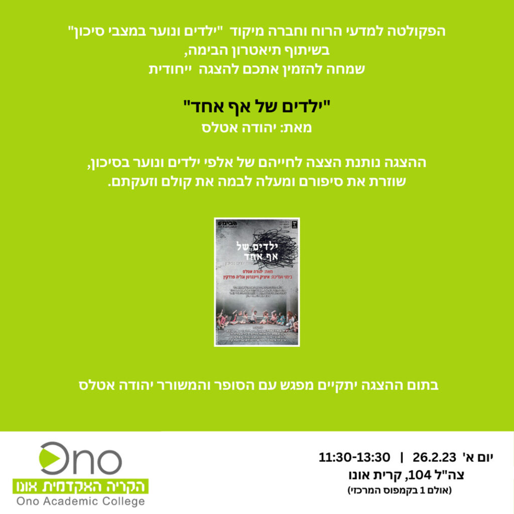The School of Humanities and its program focusing on “Children and Youth in Risk Situations” in cooperation with Israel’s nationally renowned Habima Theater, hosted the unique play, “Nobody’s Children” by the playwright, Yehuda Atlas.