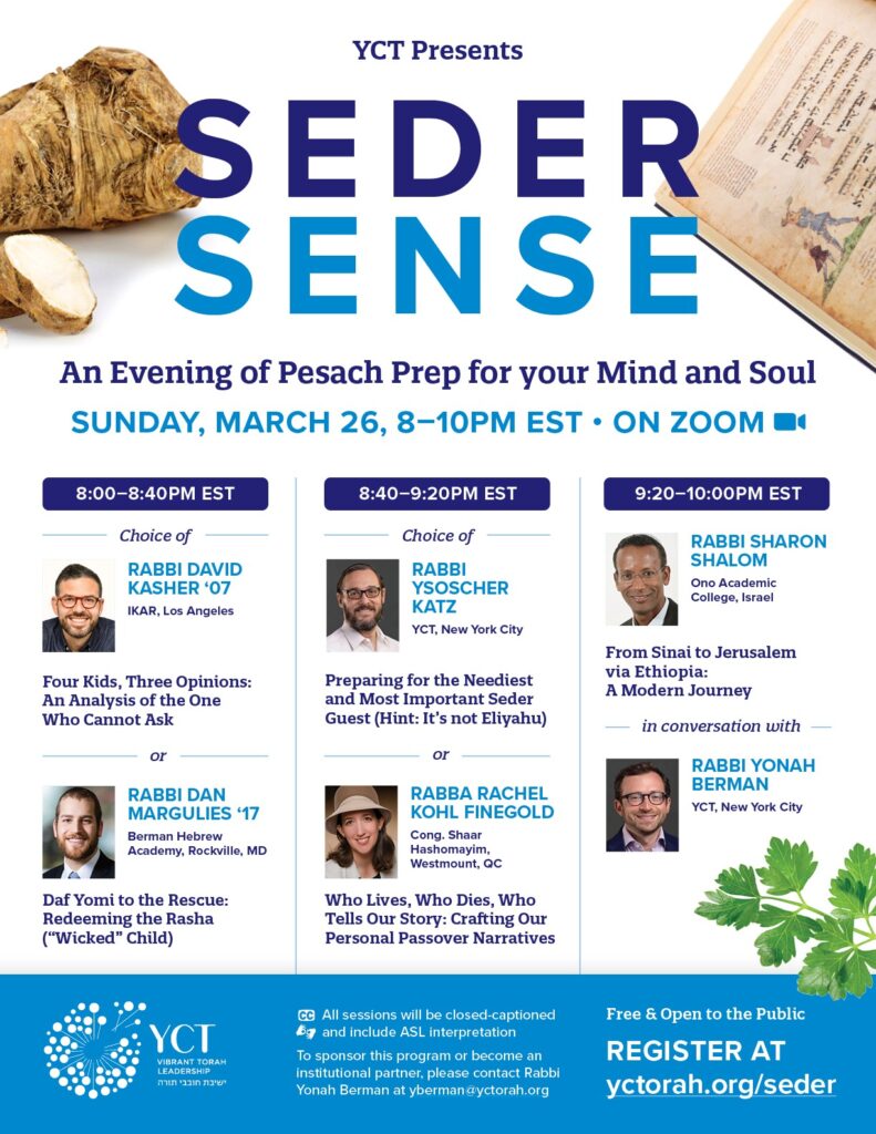 The event is accessible by zoom. For more information, click here: www.yctorah.org/seder