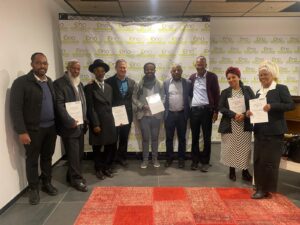 The conference concluded with an emotional singing of the national anthem, Hatikva (“The Hope”). Afterwards, members of the UJA program including managers, Rabbi Dr. Sharon Shalom, Adv. Zeev Kaso, Dr. Samuel Schwartz, Dereve Fikadie (program coordinator) and participants Efrat Zamaro, Ilana Kaso, Rabbi Adiel Eliyahu, Avraham Tsegaye, and Rabbi Gavriel Tedesse got together for group picture holding copies of the program intervention document handed out to all the conference participants. Keis Aviyu Azaria, Keis Shimon Elias and Bat El Falaka had to leave earlier.