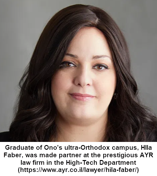 • Hila Faber, Bachelor’s Degree in Law (on the Haredi campus), was appointed as a partner at the AYR law firm.