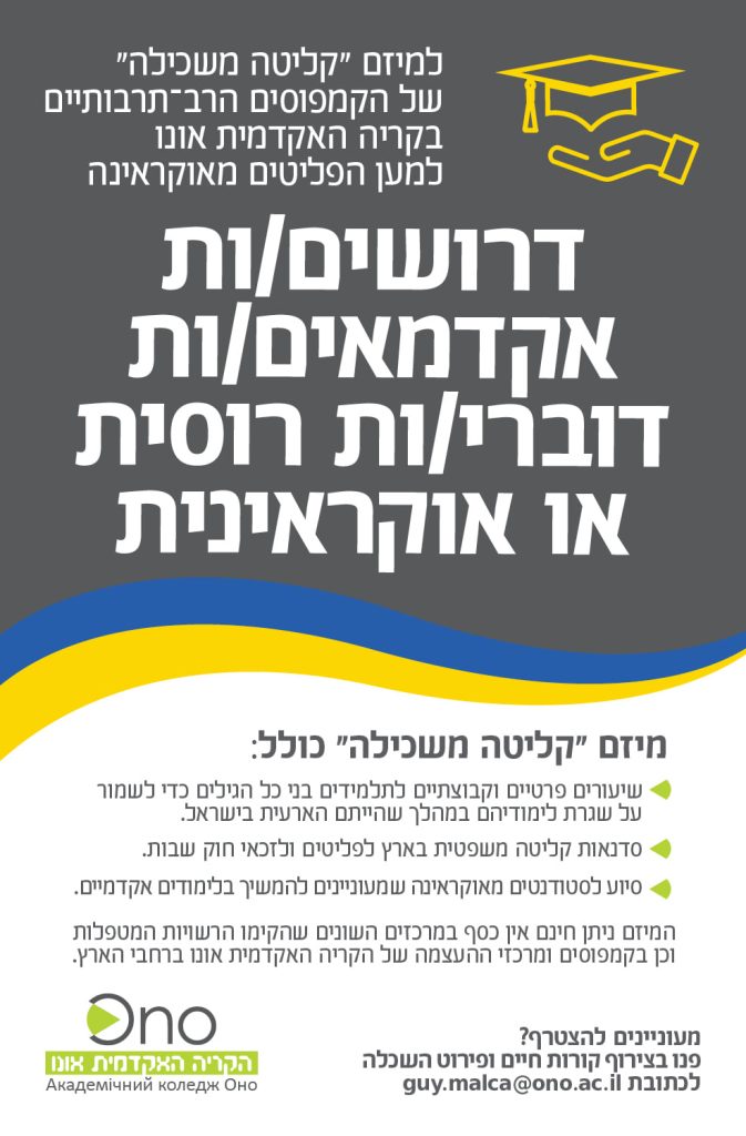 Ono Academic College’s Multicultural Campuses “Educated Absorption” Project to assist Ukrainian Refugees is looking for Academics who Speak Russian or Ukrainian