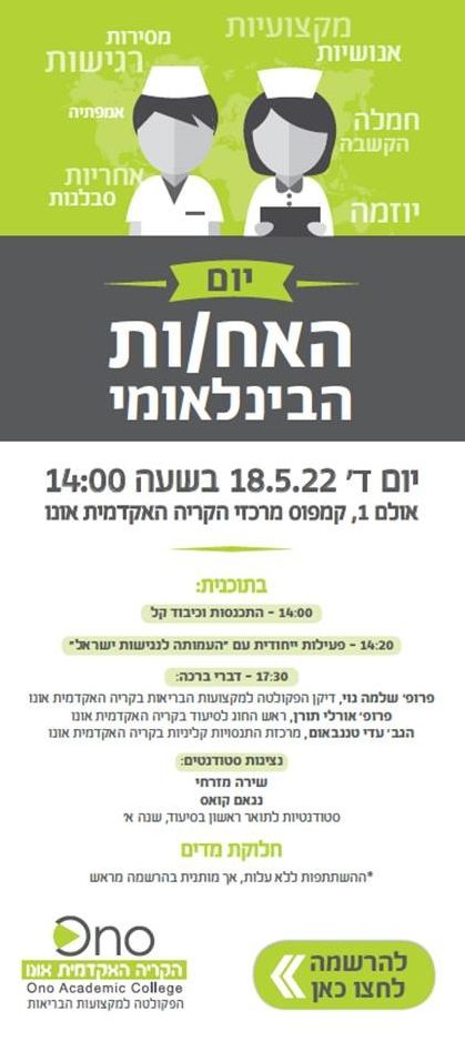 Ono Academic College’s Department of Nursing in collaboration with the Israel Accessibility Association is pleased to invite you to its celebration of International Nursing Day on 18 May 2022.