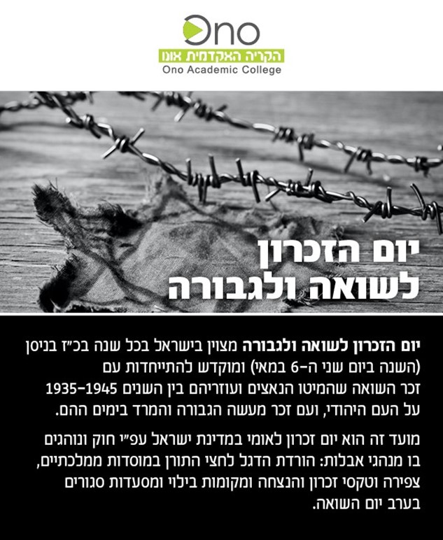 Ono Academic College marks Israel’s Day of Remembrance for the Holocaust and Jewish Heroism which is observed every year on the 27th day of the Hebrew month of Nisan. This year the memorial day begins on Sunday night May 5th and concludes at sundown on Monday, May 6. The day is dedicated to commemorating the memory of those murdered during the Holocaust by the Nazis and and their collaborators between 1935-1945. The day also recalls the memory of the acts of Jewish heroism and rebellion in those days.