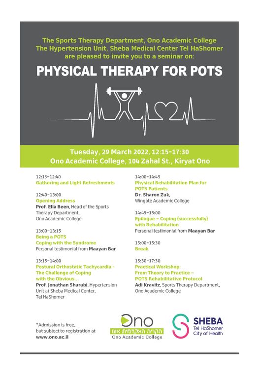 The Sports Therapy Department, Ono Academic College and the Hypertension Unit of Sheba Medical Center Tel HaShomer will be conducting a a seminar on Physical Therapy for Postural Orthostatic Tachycardia Syndrome (POTS).