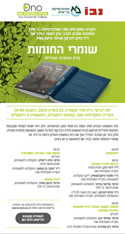Ono Academic College and Bar Ilan University invite you to the launch of the new book by Dr. Haim Zicherman and Prof. Gideon Sapir, entitled, ‘”The Keeper of the Walls: The Supreme Court and ultra-Orthodox Society.