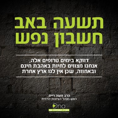 On the occasion of the Tish’a B’Av holiday and fast, Rabbi Moshe Reiss, Director of Ono Academic College’s Religious Zionist Program delivered a powerful message noting that on this day, more than ever, we need to perform an accounting of the soul. These crazy days require us to live with more unbridled love to our fellow citizens and behave in a spirit of brotherhood because, indeed, we have no other home.