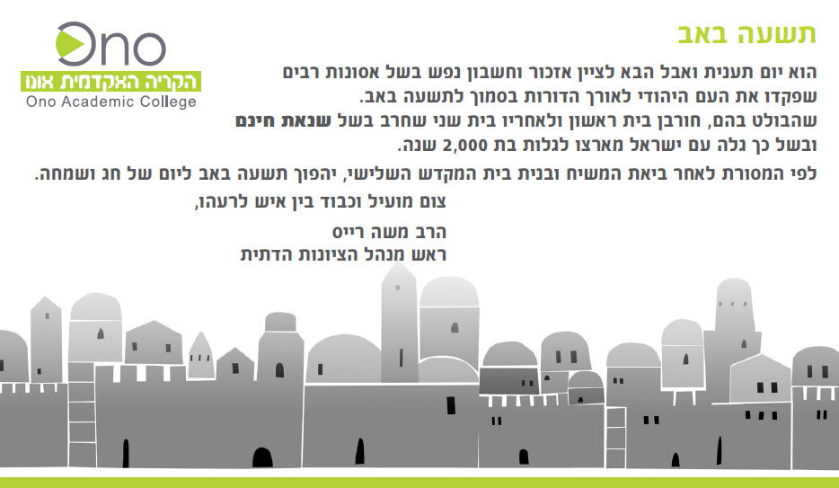 Today is the 9th Day of the Hebrew Month of Av, a day of mourning and soul searching regarding the many catastrophes that have afflicted the Jewish people over the generations on and around this date. The most striking tragedies were the destruction of the first and second Temples in Jerusalem, according to our sages, because of the sin of baseless hatred. As a result, the nation of Israel was exiled from its land 2,00 years ago. According to tradition, following the messiah’s arrival, Tish’a B’av will become a national day of celebration. May those who refrain from eating and drinking today have an easy and meaningful fast.