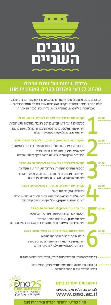 Ono Academic College’s Judaic Studies department invites the public to a fascinating lecture series in which each meeting will feature two lecturers with divergent viewpoints. They may not always agree but they will interact, exchange opinions, debate and respect each other