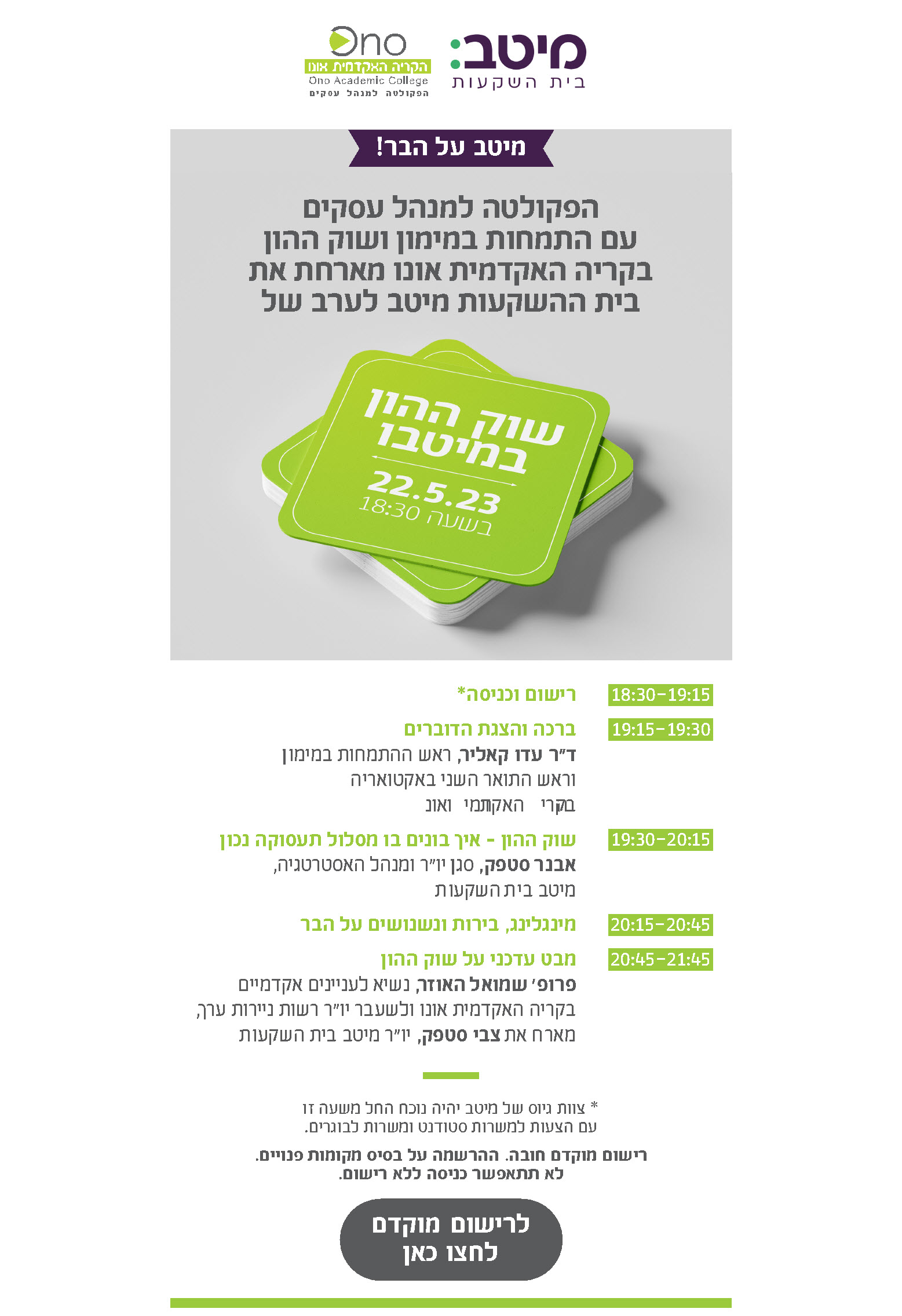 You can stop receiving these messages at any time by contacting marketing@ono.ac.il, or by clicking on Unsubscribe, or by following any other instructions included in emails sent to you.