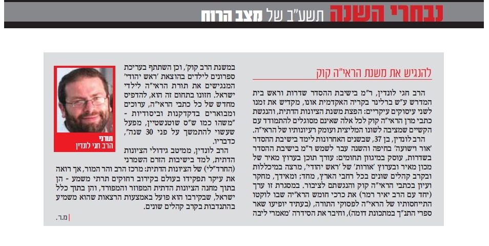 הרב חגי לונדין, ראש בית המדרש החברתי ע”ש לב-ברלינר באונו הוא “נבחר השנה” של הציונות הדתית